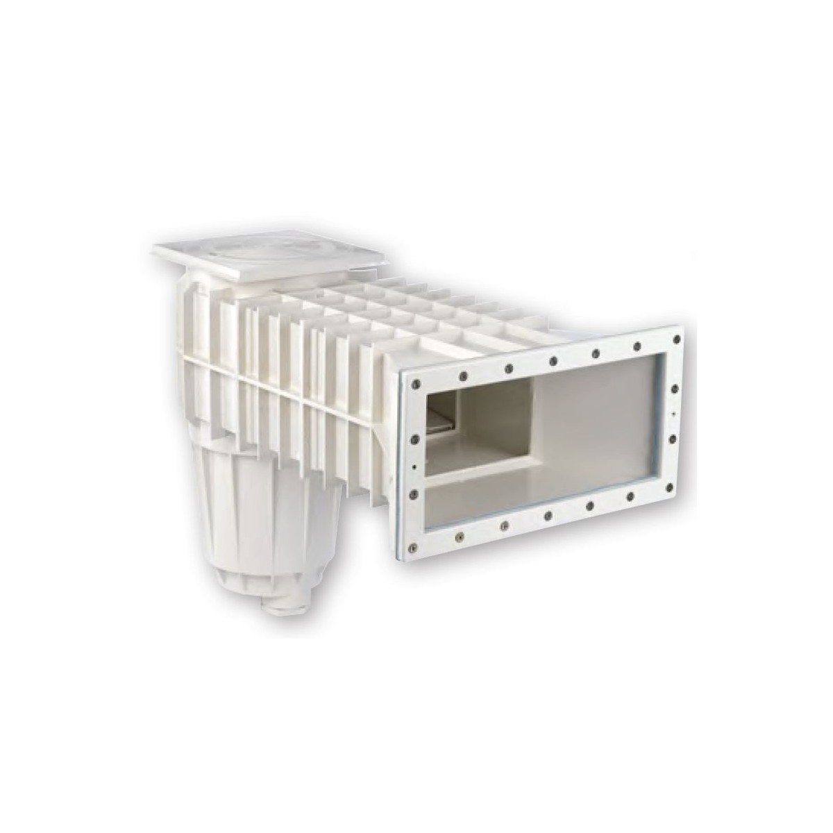 Skimmer Pool's with countersunk mouth and double extension for pools in prefab panels in metal or concrete with membrane in PVC for surface suction. The skimmer features a wall mouth which is crossed by the free water line. The interior is equipped with a patented floating and anti-noise shutter which facilitates the surface overflow regardless of the water level.