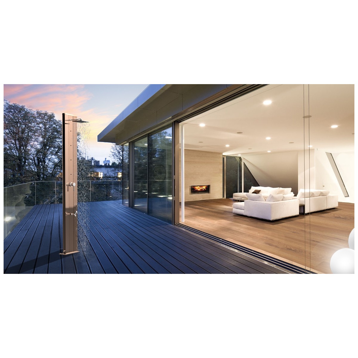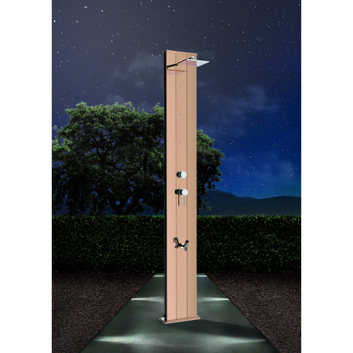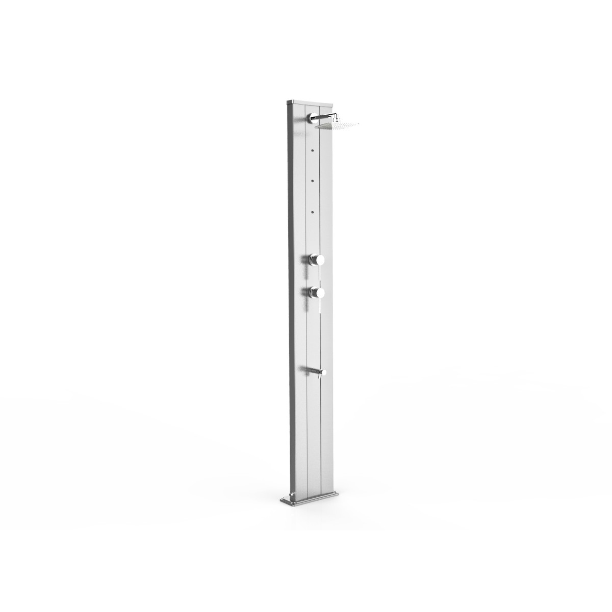 The solar shower Dada Straight TOP LINE produced by Arkema Design features a body in aluminium, a mixer faucet, a footwasher and a water mister; in addition, it is enameled by means of a liquid paint.