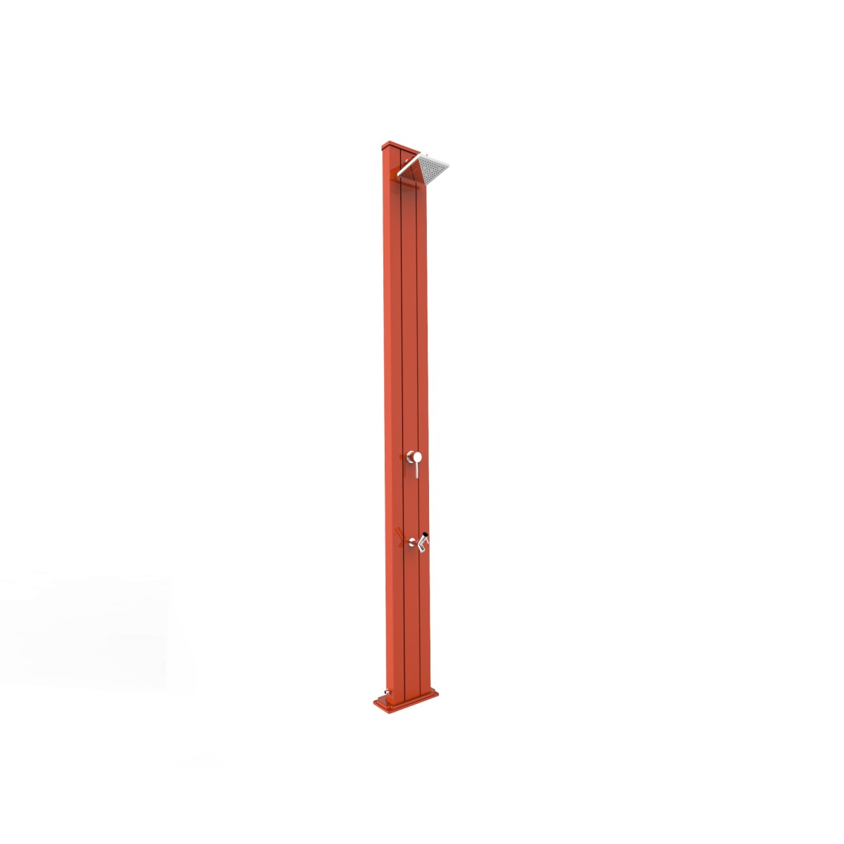 Corpo doccia che funge da serbatoio per l'acqua calda. Costituito in alluminio colorato. Dotato di miscelatore acqua calda e fredda in acciaio cromato e rubinetto lavapiedi, sempre in acciaio cromato. Soffione orientabile ed attacco filettato per il collegamento idrico alla rete e tappo di svuotamento completano la dotazione di questa doccia. Il collegamento con l'impianto idrico è semplicissimo, basta un tubo per annaffiare il giardino.